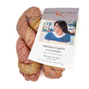 This kit pairs Cat Bordhi’s magical Moebius cowl construction with two skeins of Handmaiden Fine Yarns Grande Godiva for a small, ultra plush project. Grande Godiva is a 50/50 wool and silk super bulky with a soft sheen and cozy weight, so it works up into a thick, cushy cowl that really shows off the yarn’s hand dyed color. The pattern walks you through Cat’s signature Moebius cast on, giving you a meditative, skills-forward knit that still only uses a couple skeins.